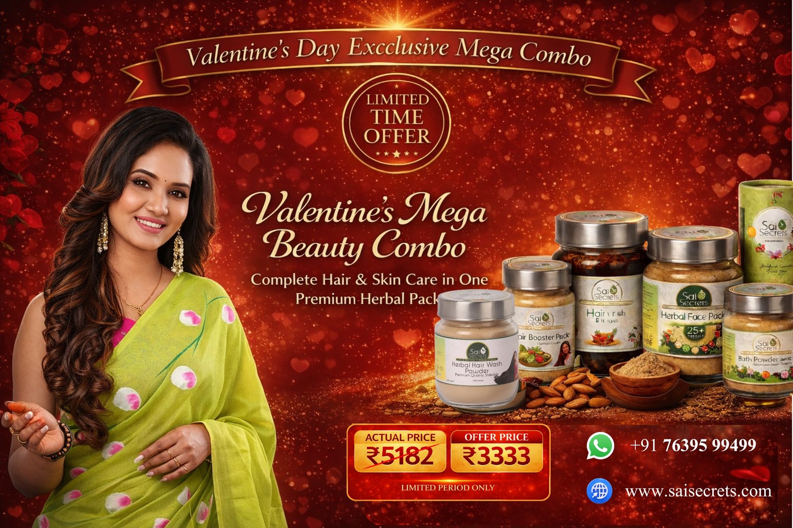 Discover radiant beauty with our Sai Secrets Combos! Choose the Small Combo for essential skincare or the Big Combo for comprehensive hair and skin care. Each combo features 100% natural ingredients for visible results in just weeks!