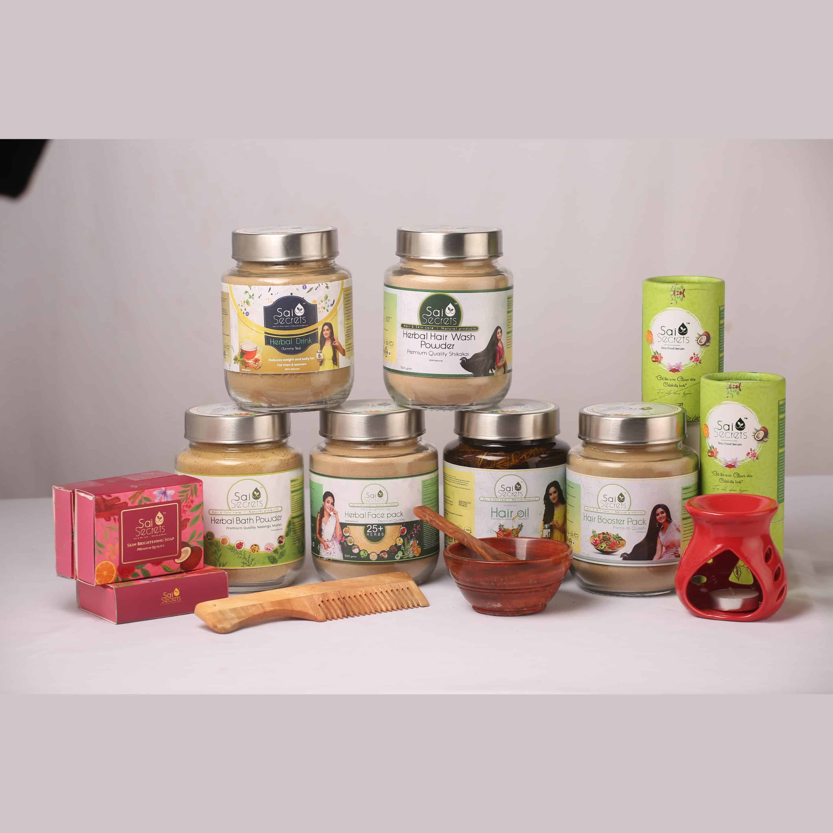 Hair Oil – 750ml | Hair Pack – 500grms | Shikkakai – 500grms | Face pack-500grms | Bath Powder-500grms | Herbal Drink Tummy Tea-500grms | Skin Food Serum-200ml | Skin Brightening Soaps-5nos