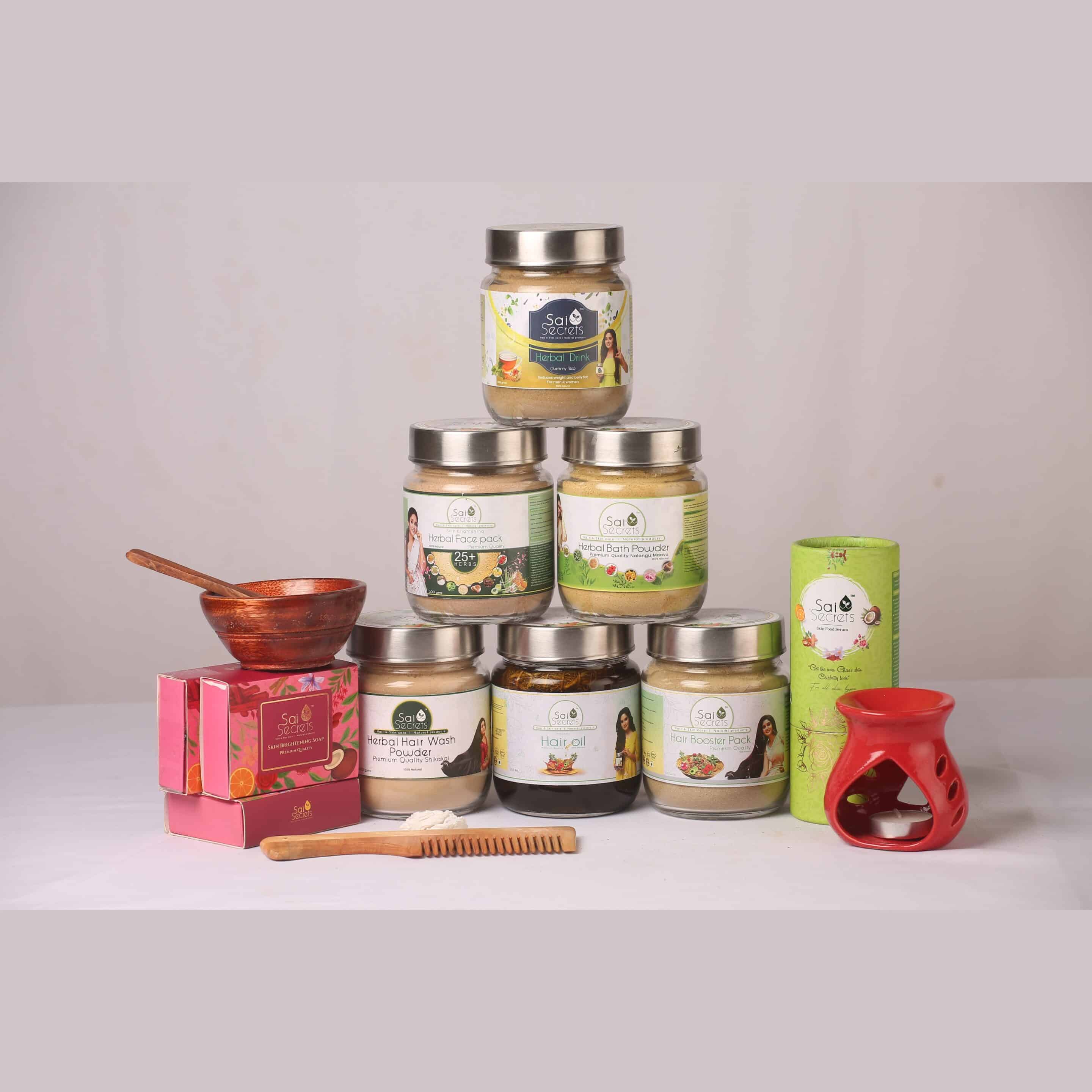 Hair oil-500ml | Shikkakai-300grms |Hair pack-300grms |Face pack-300grms | Bath powder-300grms | Herbal drink Tummy tea-300grms | skin food serum-100ml | skin brightening soaps-3nos